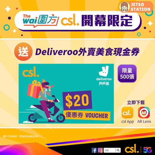 7日限定!嚟大圍「圍方 The Wai」csl 專門店即送你$20 Deliveroo現金券~「圍方 The Wai」csl 專門店現已投入服務!csl為你送上限時禮遇,嚟圍方嘅 csl 專門店出示呢個post兼下載 csl App 或 AR Lens即送你$20 Deliveroo現金券!