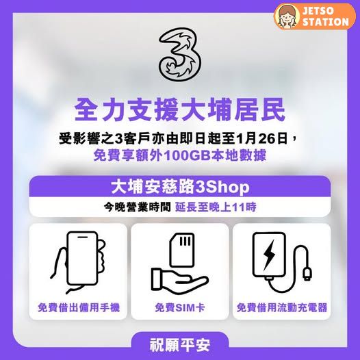 受影響的3客戶亦由即日起至1月26日,可免費享額外100GB本地數據,方便隨時接收最新消息及保持聯繫。