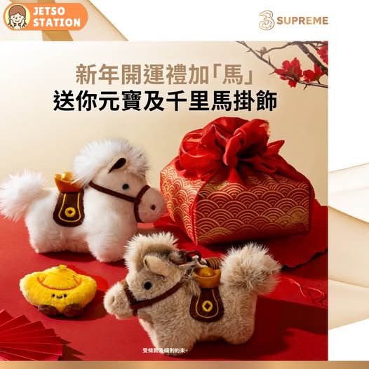 3SUPREME 與你共賀馬年新春,由即日起至2月19日,親臨門市並追蹤我們的 Instagram 或 Facebook 專頁,即可免費獲贈可愛元寶造型毛公仔掛飾,願你新一年元氣滿滿、招財進寶!