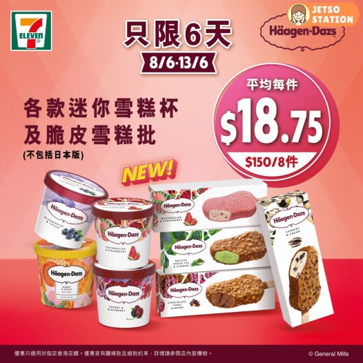 7-Eleven 著數之選 : Häagen-Dazs各款雪糕 $150/8件 (至13/6)