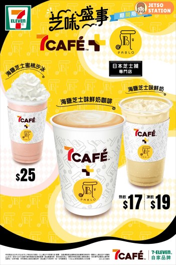 7-Eleven 自家品牌 7CAFÉ 首度聯乘日本超人氣芝士撻專門店PABLO,推出3款期間限定「芝」味飲品,包括:海鹽芝士味鮮奶咖啡、海鹽芝士味鮮奶、及 7CAFÉ+或指定店舖限定的海鹽芝士蜜桃沙冰。