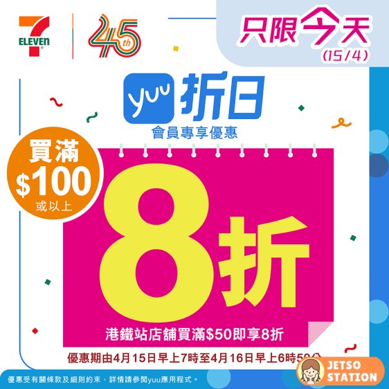 為慶祝7-Eleven 45歲生日,送上 yuu會員專享優惠! 只限今日!嚟7仔單一購物滿$100,即享8折優惠^!港鐵站店舖只需滿$50即享!超多超值產品等緊你!指定貨品仲可以儲埋7仔yuu印花~即刻睇吓有咩著數優惠帶返屋企啦!