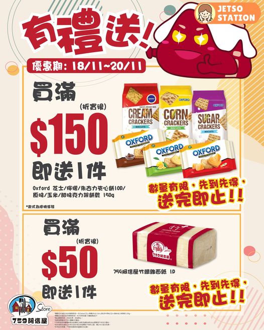 *購買任何滿$150(折實價)即送一件Oxford 芝士/檸檬/朱古力夾心餅10P/原味/玉米/甜味克力架餅乾 150g。