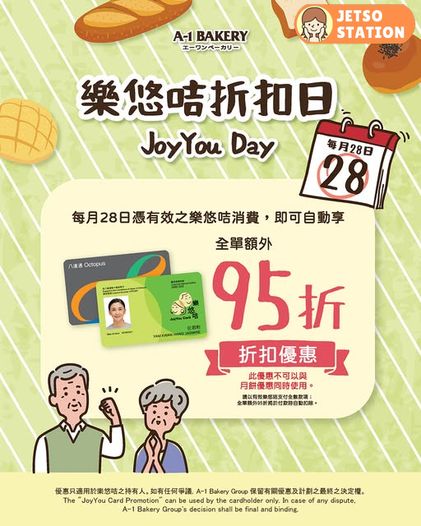 每月28日憑有效之樂悠咭於 A-1 Bakery 門市消費,即可享全單額外95折優惠!此優惠不可以與月餅優惠同時使用。