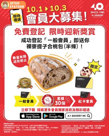限時禮遇,只限3天!由即日起至2025年10月3日,下載 A-1 Bakery 官方手機應用程式並登記成為「一般會員」,限時免費賞您迎新禮遇 — 「 裸麥提子合桃包 (半個) 」電子優惠券乙張 (價值HK$16) ,登記費用全免!成功登記後,相關迎新禮遇之電子換領券將於翌日凌晨3時由系統自動發送至「優惠券」頁面。