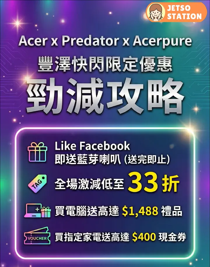 將軍澳街坊注意!免費送藍牙喇叭!Acer x Predator x Acerpure 殺入新都城豐澤,AI PC、電競裝備、生活家電一次過睇晒,工作+打機+生活一次搞掂!