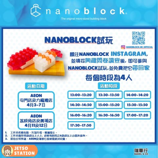 人氣日本積木品牌Nanoblock將為AEON帶來全新試玩體驗。只需於指定日期及及時間到指定店鋪,並關注NANOBLOCK INSTAGRAM及填妥興趣問卷調查後,即可參與!