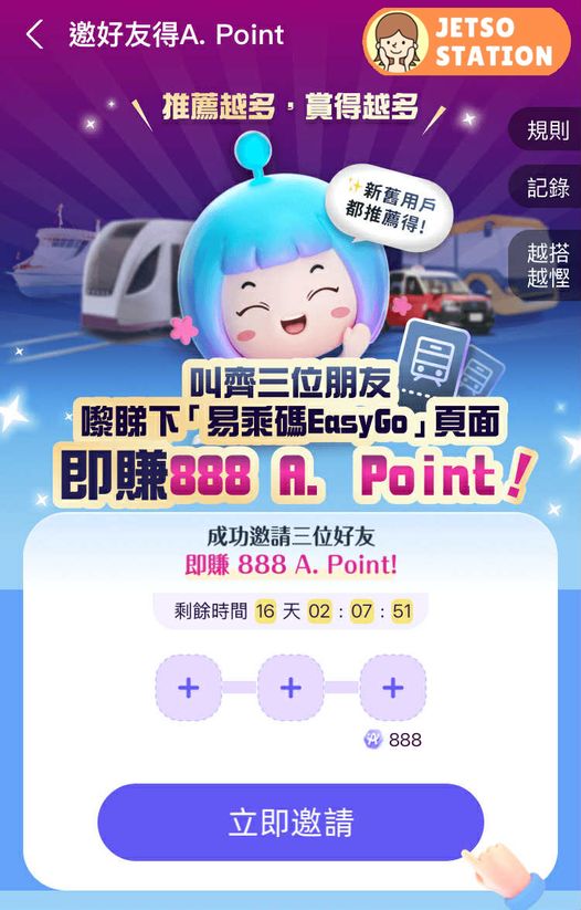 (1) 打開AlipayHK-> 搜尋欄輸入 「香港易乘碼」-> 撳入頁底廣告Banner->「邀請好友」-> 每邀請3位朋友幫你撳連結,即送888 A.point。最多送2,664 A.point
