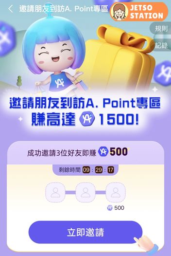 由即日起2025年8月31日,進入AlipayHK 支付寶 「邀請好友到訪A.point專區」,按助力送京東20元券,邀請好友再送1500 A.point 積分!