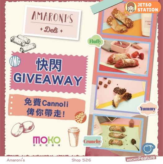 *活動只在指定日期、時間及分店進行,首30位到達MOKO新世紀廣場Amaroni’s (Shop 526, L5) 並完成以上換領步驟者,可免費獲得Cannoli一件 (口味隨機)