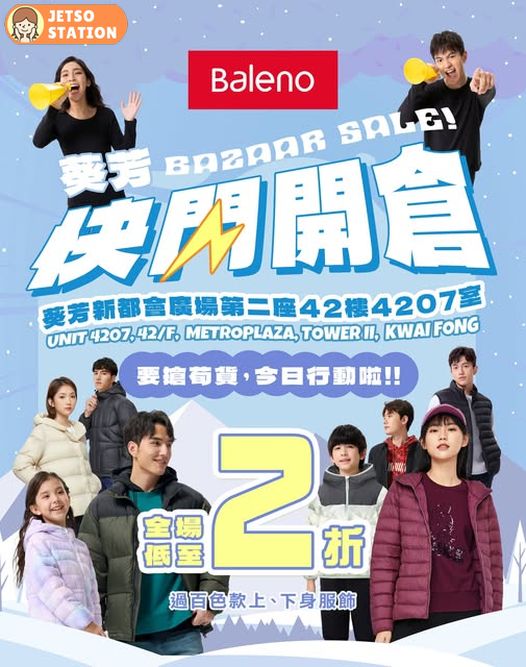 現場直擊!20/1至23/1 & 26/1,Baleno於葵芳新都會廣場42樓舉行開倉大放送,現場超多男裝/女裝/童裝服飾享勁抵折扣,包括多款衛衣、羽絨、功能外套、針織系列、長褲、保暖衣、內衣褲及襪款等等,低至2折!部分款式數量有限,先到先得,想掃貨記得要快人一步呀!