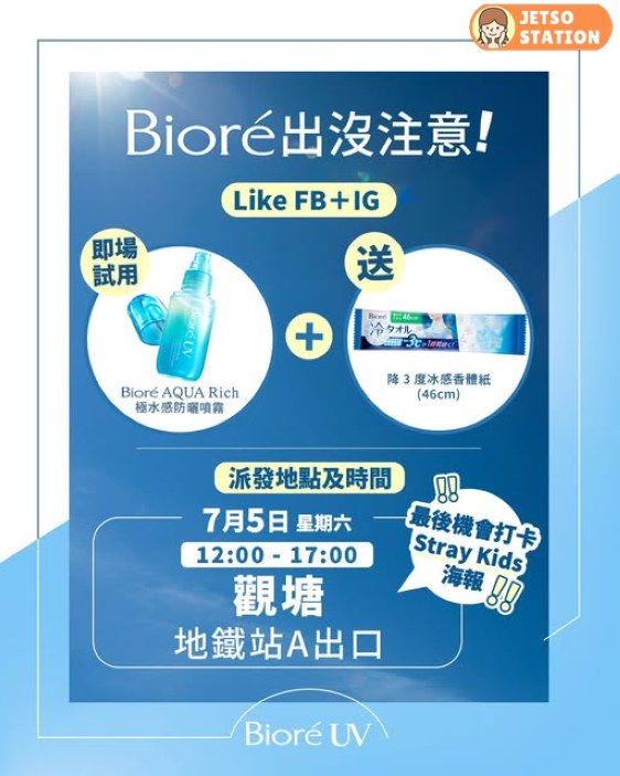 Stray Kids海報打卡最後機會!最近天氣陰晴不定,時而暴雨時而酷曬。Bioré今次特別去到觀塘,為大家準備防曬加降溫雙重神器,幫你對抗悶熱天氣,預防中暑不適!