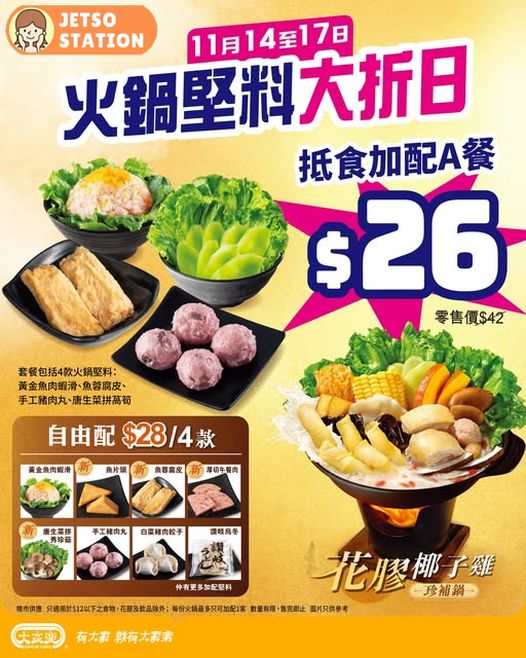 打邊爐成日都心思思想試勻不同配料?大家樂嘅火鍋堅料大折日幫到你!喺11月14日至17日期間,凡惠顧任何火鍋,即可以$26加購抵食加配A餐,一共有4款堅料,抵食又滿足!想自己揀堅料?亦可以 $28 任揀4款 !款款都咁正!勁抵食!