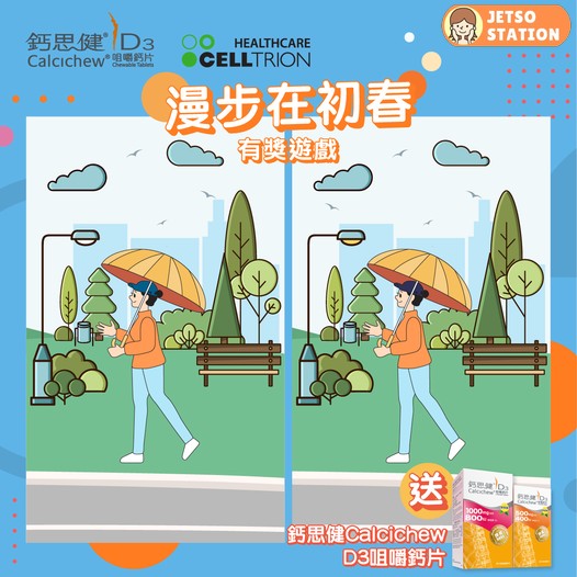 【漫步在初春 #有獎遊戲】春天即將來臨,春雨過後,大地回暖,最適宜外出散步,順便吸收陽光,活化體內嘅維他命D。不過淨係吸光唔夠㗎,仲要靠鈣思健Calcichew D3咀嚼鈣片,幫你補充鈣質之餘,每粒都包含維他命D3,同樣可以幫助鈣質吸收!由即日起至3月7日,考考大家眼力,喺以下兩張圖片搵出不同之處,並以文字描述,即有機會贏取獎品!