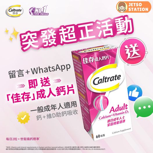 成功參加者將有專人聯絡你,收集姓名、電話同順豐站地址,即可免費包郵獲得一盒「佳存」成人鈣片(僅限順豐站自取)!