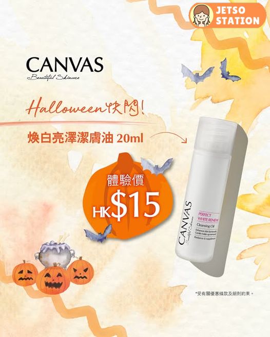 【Halloween 「驚」喜優惠!體驗價$入手潔膚油20ml 】為萬聖節準備Party 妝容,化妝要出色,卸妝更要徹底!Whatsapp CANVAS領取驚喜優惠券,以體驗價HK$入手CANVAS煥白亮澤潔膚油20ml一支。