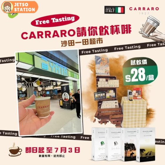由即日起至7月3日,Caffè Carraro 於沙田一田超市正門前,進行免費試飲,於沙田一田門市選購 Caffè Carraro 咖啡膠囊,即享試飲價 $28/盒 優惠,快啲嚟試飲啦!數量有限,送完即止!