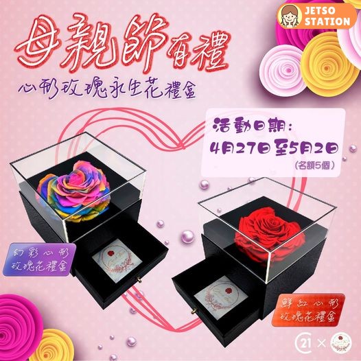 母親節快到了!諗緊送咩禮物俾媽媽?送花經常會被媽媽訓說:花唔食得又擺唔耐,浪費錢啦!口說不要但十個媽媽九個媽媽都喜歡花,不妨考慮送由真花製成的永生花,保存期比鮮花長,永不凋謝,亦代表對媽媽永恆和無限的愛意。