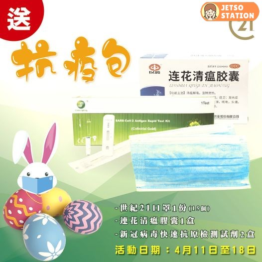 【世紀21送您抗疫包】4月21日就會陸續放寬社交距離措施,學校亦都會分階段復課但個人衛生及防疫意識依然不能鬆懈,勤洗手、帶口罩同定期做快測,保障自己同屋企人健康。世紀21與你同心抗疫,送你 「抗疫包」內有世紀21口罩1份;連花清瘟膠囊1盒;快速測試劑2盒。(名額20個)