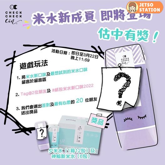 【獅隧競猜米水新口味Giveaway】讓各位「米粉」久等了! CheckCheckCin即將推出全新口味米水!有頭緒是什麼口味嗎?大家最想嘗試的是那款口味?小編預告:這款米水除可健脾胃,其中一款材料能有效抗氧化!沙田友們這星期中經過獅子山隧道時留意一下便會知曉!為鼓勵大家齊齊強身健體,享受米水所帶來的好處,由3月15日至20日期間,將你們猜到的答案以及最想嘗試的米水口味,於這篇帖文留言*,便有機會獲得夕紙包米水一箱及新口味米水共6包!名額共20位,先到先得,切勿錯過!