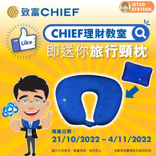 Ter總提提你,讚好「CHIEF理財教室」專頁送旅行頸枕活動將會係嚟星期五就完喇!快啲參加活動,拎返個頸枕去旅行喇!先到先得,數量有限,送完即止。