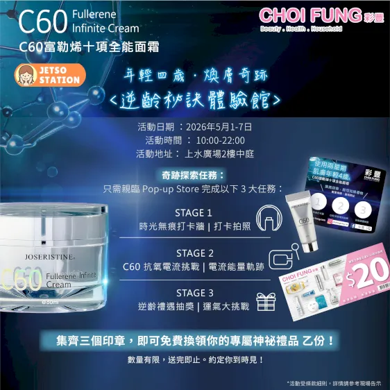 快啲嚟參加「年輕四歲.煥膚奇跡」逆齡秘訣體驗館活動啦!彩豐特別於上水廣場 2 樓中庭準備咗一系列精彩任務同女神見面環節,等大家現場探索 #C60富勒烯十項全能面霜 嘅逆齡秘密,一齊重拾緊緻有彈性嘅靚靚肌膚!