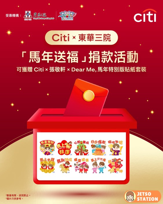 【Citi x 東華三院推出「馬年送福」捐款活動,可獲贈「Citi x 張敬軒 x Dear me, 馬年特別版貼紙套裝」】