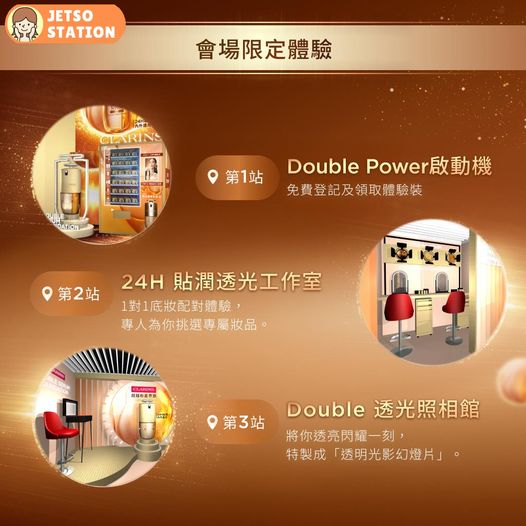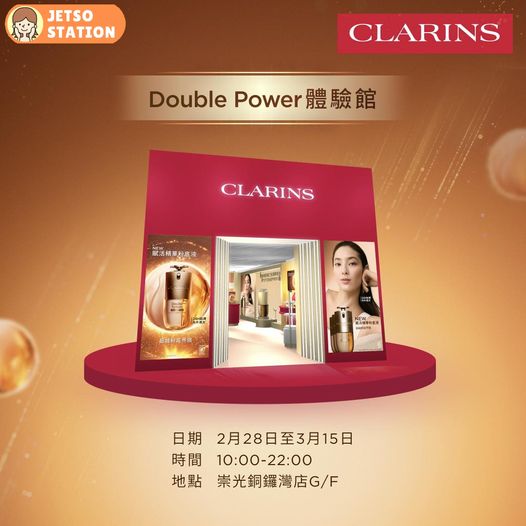 延續 #DoubleSerum 40年抗老修護傳奇,CLARINS隆重推出 #DoubleSerumFoundation 賦活精華粉底液。隆重呈獻期間限定 [Double Power體驗館] ,多項會場體驗活動,親身解鎖精華養妝秘密,更可免費體驗1:1 專人底妝配對服務,教你打做出最適合你嘅透亮妝效,仲有多個打卡位讓你留住「Double透亮」瞬間,再專享不同限定禮遇^!完成4站體驗後,可獲得體驗裝。