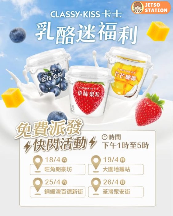 嚟緊兩個週末,我哋會喺以下地點有免費派發卡士乳酪嘅快閃活動,只要現場讚好卡士的Facebook 或Instagram專頁,即可免費獲得水果乳酪一杯* 快啲mark低以下日子同地點,約埋親朋好友一齊嚟喇!