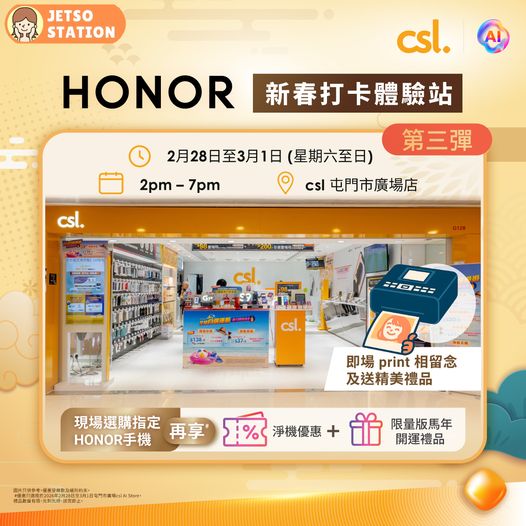 仲喺農曆新年 holiday mood 緊?今個 weekend 嚟喺屯門 csl AI Store 最後加推的「HONOR 新春打卡體驗站」,捉緊尾巴影靚相開啟新年好運啦!我哋繼續為你準備咗多款新春主題 props 俾你拎住打卡,仲可以即場 print 相留念,同送你精美禮品!現場選購指定 HONOR 手機更享淨機優惠,加送你高達 $4,800 禮遇,仲額外送你限量版馬年開運禮品#。