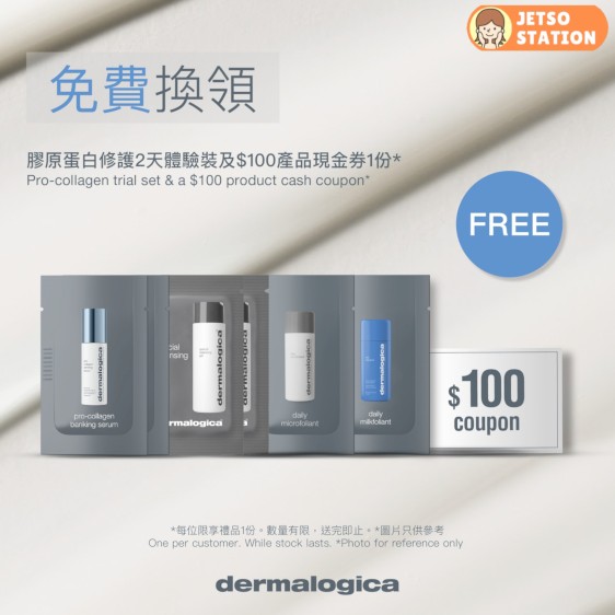 禮遇一: 由即日起至7/3/2024期間,凡親臨海運大廈2/F Facesss 推廣專櫃,即場「讚好」 Dermalogica Hong Kong專頁 / 「追蹤」dermalogica_hk ,「讚好」及「分享」此帖文即可免費換領膠原蛋白修護2天體驗套裝,除了有最新膠原蛋白修護精華 外,亦包括「微型美白酵素粉末」、「潔面啫喱」等皇牌產品試用裝及$100產品現金券1份*。