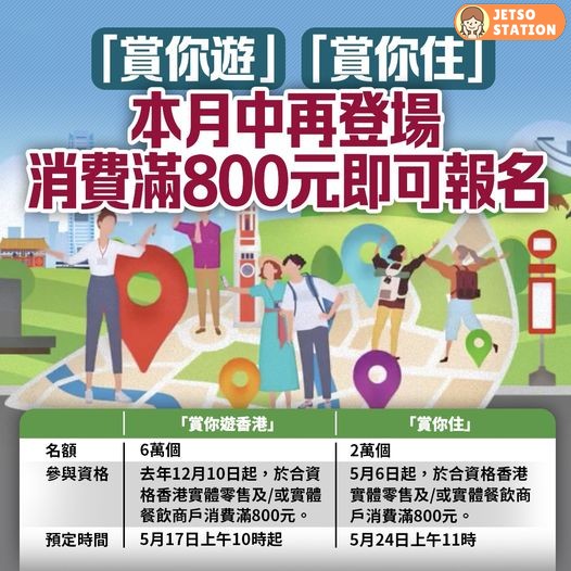 香港旅遊發展局宣布推出「夏日同賞.就在香港」推廣活動,頭炮重推「賞你遊香港」和「賞你住」合共8萬個名額,為市民提供本地遊以及酒店住宿計劃折扣優惠。「賞你遊香港」名額6萬個,約提供300個行程,圍繞探索文化、大城小區、維港秘景和尋覓美食四大主題;「賞你住」共2萬個名額,約有100間酒店參與【參加酒店名單】。即日起,市民在本地實體零售及餐飲商戶消費滿800港元,儲起機印收據(最多兩張),即可在5月中至6月分階段報名本地遊或訂購酒店優惠。首批本地遊行程將於5月17日開始報名。