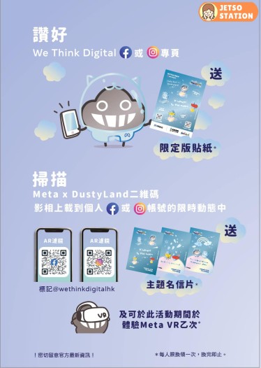 【DuskyLand x Meta 將善良帶上元宇宙】社區體驗活動 Meta 同本地插畫家 Dustykid 合作,喺中環街市嘅 DustyLand 推出期間限定元宇宙體驗活動!由6月17日至6月29日,屆時將展出數百款最精彩嘅 DustyLand NFT 作品,包括四款塵角色:塵、眼淚、心心同太陽雞,期望令塵嘅治癒力跨國界,散播到整個地球。大家嚟到 展覽,可以試玩 Meta Quest 2 VR 裝置進入元宇宙,仲可以玩由 Dustykid 同年輕人共同創造嘅 AR 濾鏡。完成指定任務仲可以獲贈 Dustykid x Meta #把善良帶上元宇宙 限量版貼紙及 AR 名信片一套添!