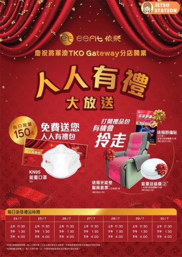 【依飛科技舒痛】將軍澳 TKO Gateway 都有依飛喇 !由7月24日至 7月30日,將軍澳 TKO Gateway 分店每日都會派發150份KN95能量口罩包!打開禮品包仲有機會拎走依飛舒痛貼10片裝 + 光能墊服務體驗卡2張(每日限量10份) ,重量級禮品仲有光能墊服務12次套票1張(每日限量1份)及 能量活絡儀2 乙個 + 光能墊服務體驗卡4張(每日限量1份)