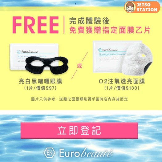 完成WATERBOOST三重水生零瑕激活免費體驗後,會立即送你以下面膜乙片(價值高達$ 130),亮白黑啫喱眼膜或O2注氧透亮面膜乙片,等你返到屋企都可以keep住靚。