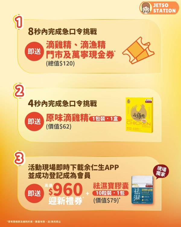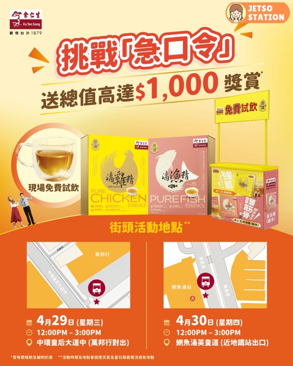 【滴雞精 × 滴漁精】出嚟同大家見面啦!一連6場快閃街頭試飲,今個星期頭兩場正式開鑼!現場挑戰急口令遊戲,只要你嚟到現場挑戰我地滴雞精或滴漁精急口令,並即場登記成為余仁生會員,即有機會贏走高達 $1000 獎品!獎品數量有限,送完即止!