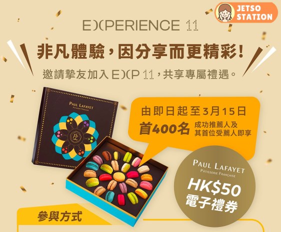 活動日期: 即日起至 2026年3月15日,現有 Experience 11 會員分享其專屬推薦連結,並且其好友透過指定連結成功登記成為 Experience 11 新會員並同意接收直接促銷訊息(「被推薦人」),即有機會獲得HK$50 Paul Lafayet 電子禮券一張。