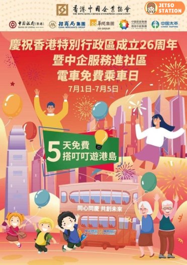 自7月1日起至7月5日,連續5天內全港市民都可以無限次免費乘搭全線普通載客電車。是次活動由香港中國企業協會聯同中國銀行(香港)、招商局集團、華潤集團、中國旅遊集團暨香港中旅(集團)與中國太平保險集團隆重舉辦。香港中國企業協會指,期望廣大香港市民開心搭乘,一同欣賞港島及維港兩岸美好風光,共享回歸喜悅。