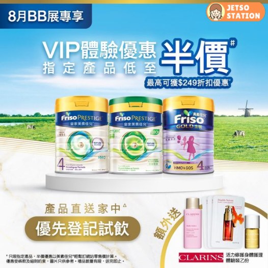 【BB展限定禮遇】BB 展又嚟啦!今次我哋特意優先準備咗限量VIP體驗優惠,俾多位爸爸媽媽 ! 於即日起至7月31日前預先登記《「第30屆國際嬰兒、兒童用品博覽」FRISO® CLUB限量尊貴VIP體驗優惠》,指定產品低至半價^!更額外送CLARINS活力修護身體護理體驗裝乙份!!