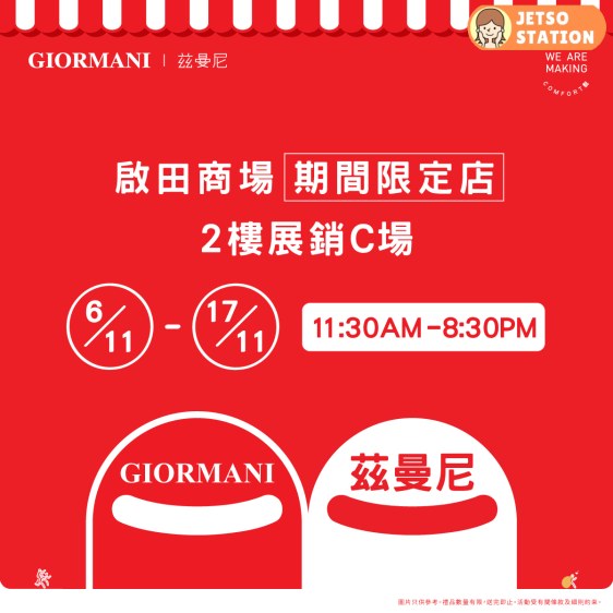 由11月6日至11月17日,一連12日 GIORMANI 茲曼尼嚟到啟田商場喇!今次帶嚟多款人氣梳化低至8折,會場限定款式更只售 $2,999!現場可親身試坐,搵返你最啱心水款。