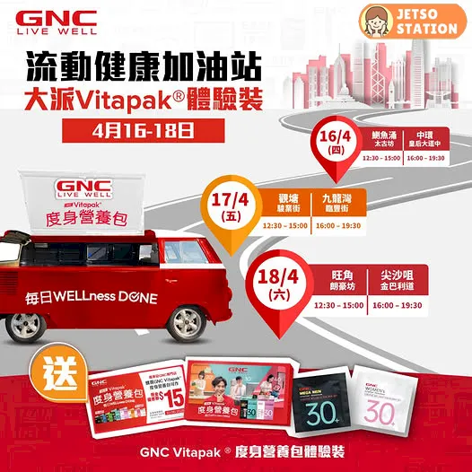 「GNC 流動健康加油站」一連三日走遍港九新界,送你全新「Vitapak ® 度身營養包體驗裝」,隨時幫你「補一補」!記得Bookmark時間地點,同我哋見面啦!