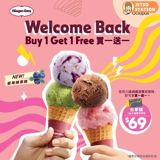 由即日起至3月29號,用八達通買Häagen-Dazs™外賣雙球雪糕,即享有$69買一送一優惠!仲可以試埋全新登場、充滿春日氣息嘅藍莓撻雪糕,幼滑雪糕拌入香濃藍莓果醬同碎餅粒,啖啖清新果漾,享受令人心動嘅法式午後時刻~