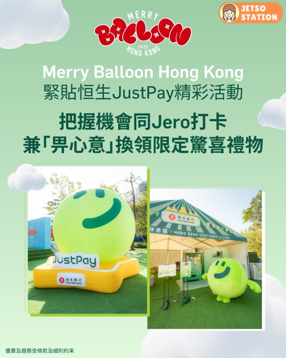 萬眾期待由恒生保險呈獻嘅年度 IP 慶典— Merry Balloon Hong Kong 已經開始咗喇!大家買晒飛準備入場一齊玩未?會場除咗有唔同 IP 角色,仲有恒生畀錢新體驗— JustPay 嘅心意擔當 Jero 同大家見面,等你嚟開心打卡!喺指定日期參與活動,仲可以獲得限定小禮物~我哋到時見!​