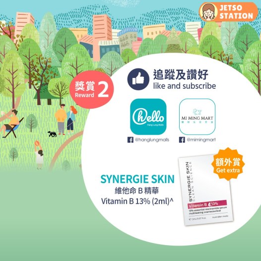 此外,追蹤及讚好 Hang Lung Malls – hello 恒隆商場獎賞計劃及彌明生活百貨社交平台專頁,即可免費獲贈 SYNERGIE SKIN 維他命 B3 精華 13% (2ml)^ (價值: HK$64) 乙份。
