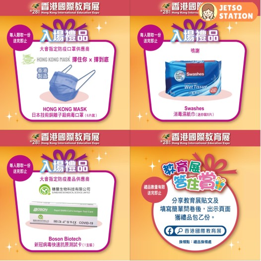 🔸 入場禮品:Boson Biotech新冠病毒快速抗原測試卡、Hong Kong Mask 日本技術銅離子殺病毒口罩、Swashes 消毒濕紙巾