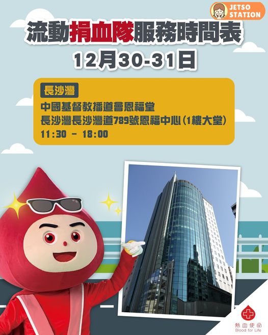 嚟緊流動捐血隊同捐血車,將會去到長沙灣、慈雲山、油塘、坑口同沙田為您服務。