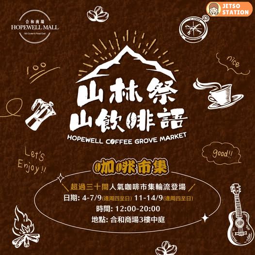 踏入9月露營季,合和商場即將舉辦首個《山林祭・山飲茶啡語》市集活動!連續兩個星期四至日,集合超過30間本地精品咖啡品牌將進駐3樓中庭,帶嚟多款掛耳包、咖啡豆、手沖器具等,讓咖啡愛好者盡情探索香氣層次!