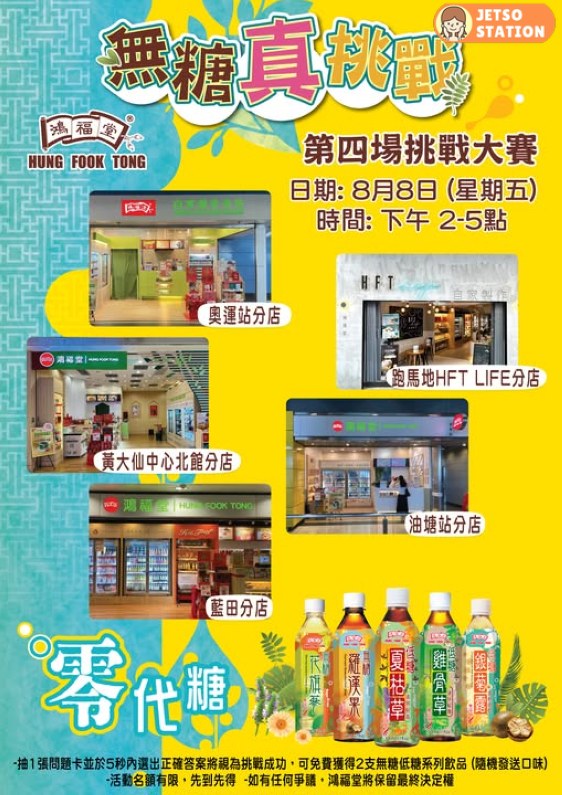 嚟到第4日無糖真挑戰啦!聽講唔少人都挑戰成功,5秒內就回答到正確答案!未挑戰嘅您,不如聽日就去以下5間門市玩下啦~ 挑戰成功免費送您鴻福堂無糖/低糖飲品2支!大家Mark定時間去啦