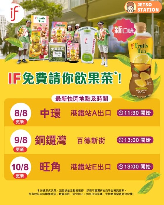 為咗令大家喺炎炎夏日stay freshy,IF將會再度遊走多區。今次快閃有新口味嘅檸檬紅茶!另外有大家好熟悉嘅蜜桃紅茶、荔枝紅茶,口味隨機派送,數量有限,送完即止!
