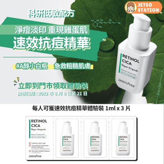 即日起至8月21日期間,到innisfree門市向員工展示換領試用裝活動頁面得即可獲得速效抗痘精華1ml 3片。仲可以即時以9折優惠購買速效抗痘套装,切勿錯過!(留試用感可得500分!)
